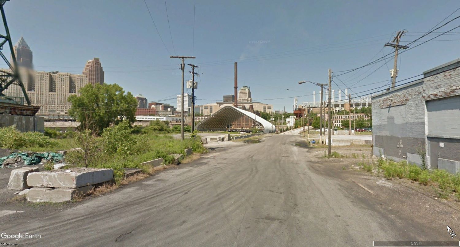 In 2011, the only signs of life along Stones Levee Road were Downtown Cleveland in the background and the Tower City Amphitheater at the center of this streetview. At right is a 110-year-old brick building that sets on 401 Stones Levee which Bedrock is acquiring (Google).