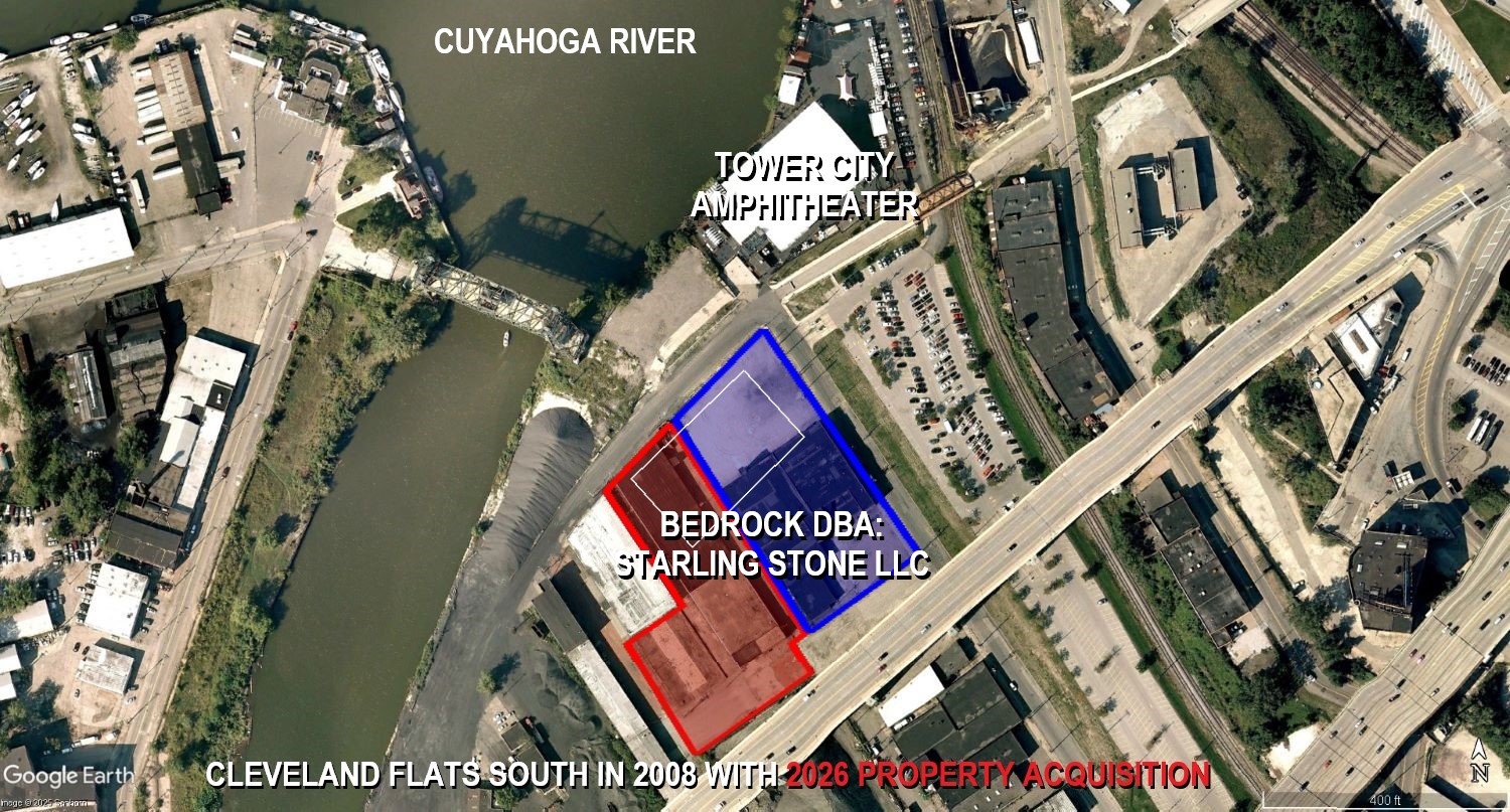 Highlighted in red is Bedrock’s latest, pending real estate acquisition — located next to another but highlighted blue that was acquired by the same Bedrock affiliate — Starling Stone LLC. The white box outline on the Starling Stone properties is the approximate scale footprint of a venue the size of the former Tower City Amphitheater (Google).