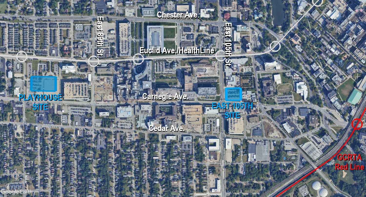 Locations of the two new parking garages on the Cleveland Clinic’s Main Campus. The Playhouse site is at 8500 Euclid Ave. and the East 105th site is at the northeast corner of East 105th Street and Carnegie Avenue (Google).