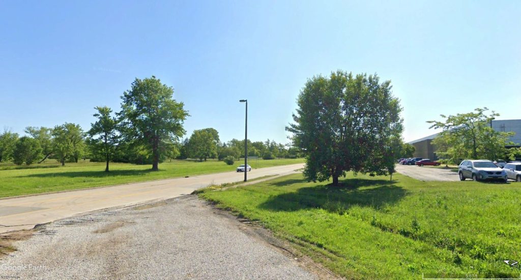 At left, across Cleveland Parkway, is the city-owned land which Scannell Properties wants to develop. At right is one of the buildings Chelm Properties built for the first phase of Cleveland Business Park. It houses Constant Aviation, an aircraft maintenance and servicing company (Google).