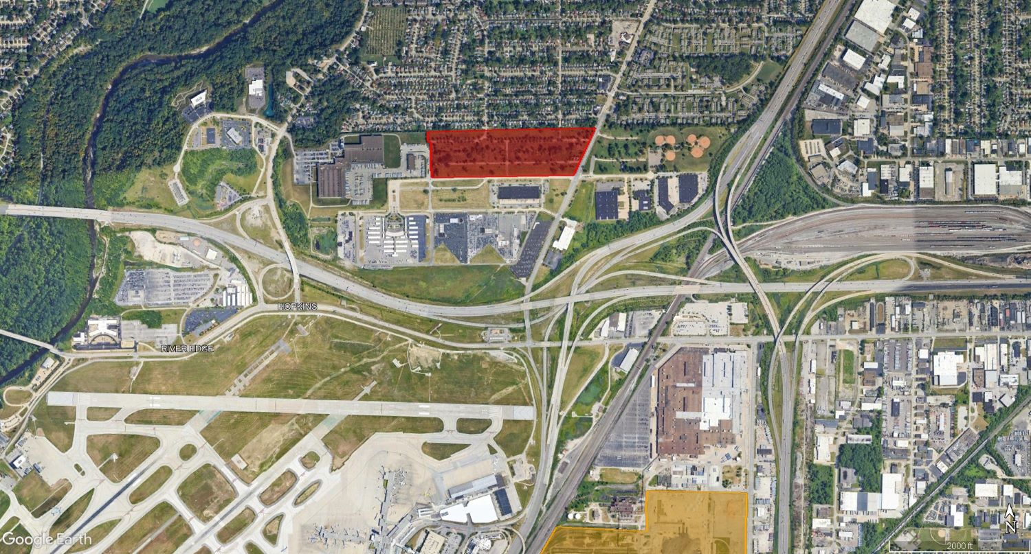 The site is located north of Cleveland Parkway, set on 170 former residential parcels owned by the city with public street rights of way threading among them. On a parcel map, it shows the ghost of a neighborhood that was cleared several decades ago in the name of airport noise abatement, which meant getting rid of residents.