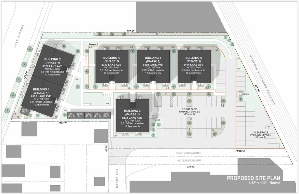 There are six buildings on the site plan — three in the first phase and three in the second phase. Each building is proposed to have 12 apartments, with four units on each of the three floors. Two of the buildings are planned along Lake, to be connected seamlessly to appear as one building. The consistency of building designs is expected to make the project more affordable to build and rent.