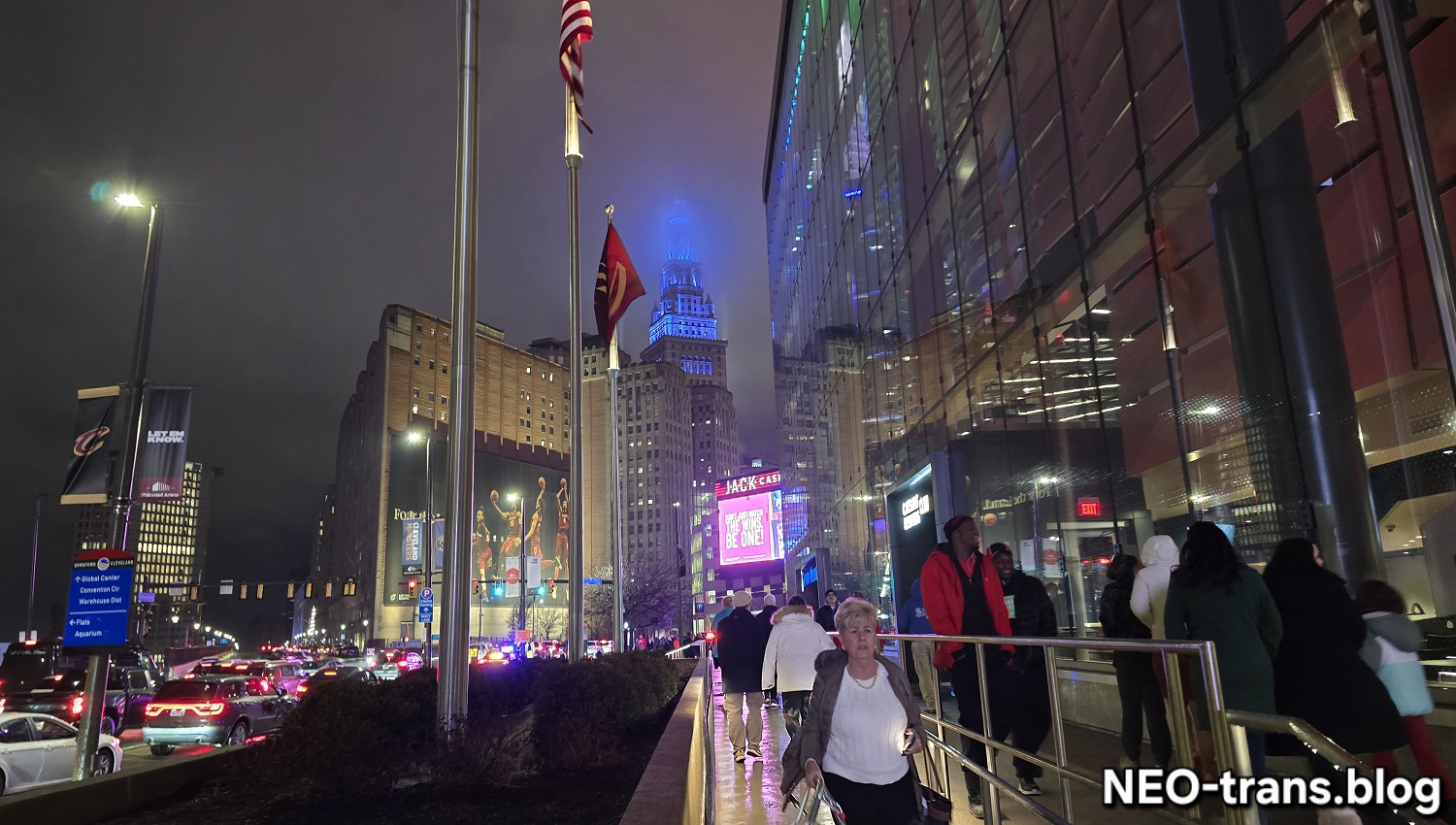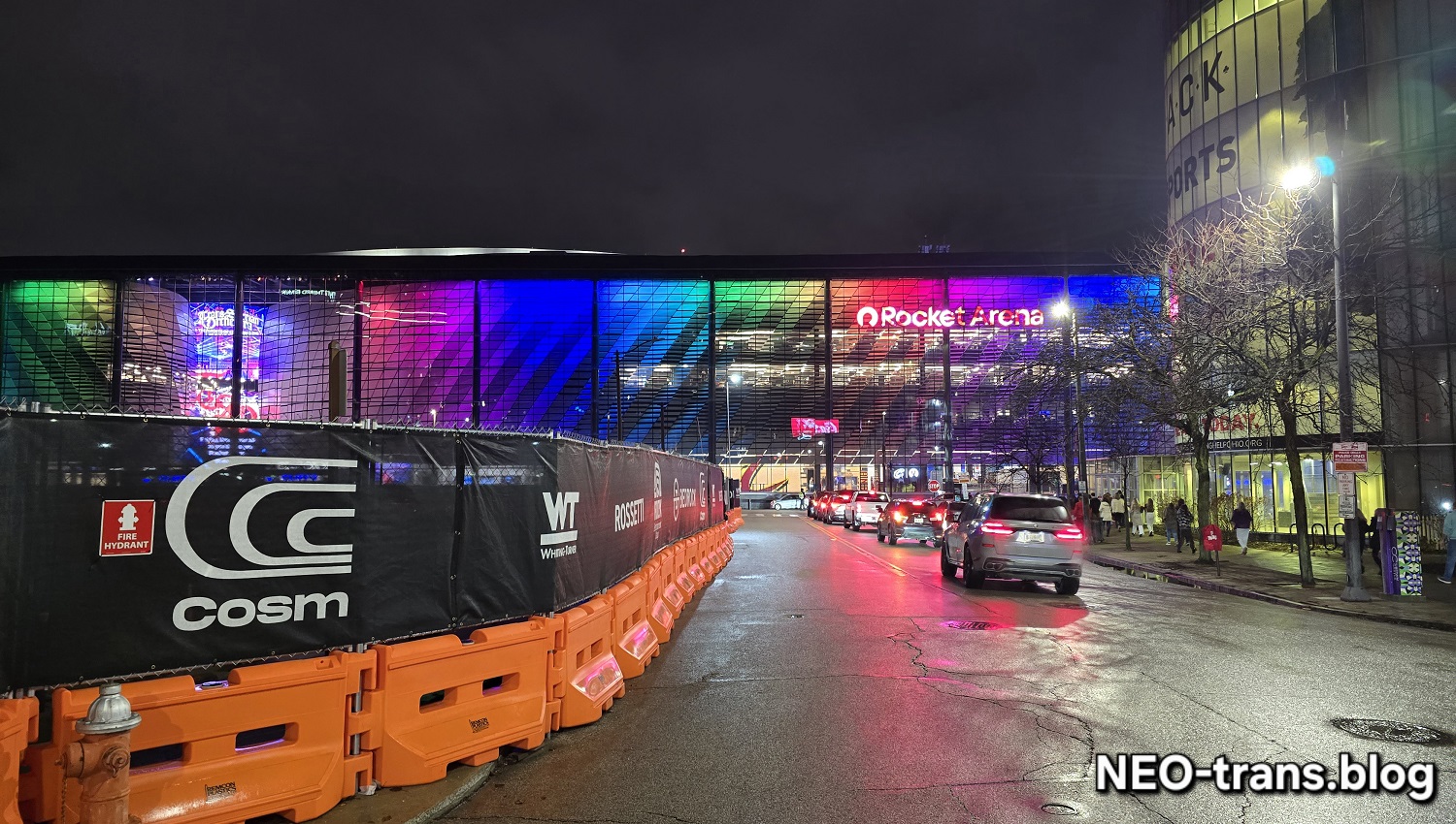 Downtown Cleveland is trying to increase a mix of sports and entertainment attractions that are smaller but more frequent than those of the Cleveland Browns, which are moving to suburban Brook Park. One of those is the Cosm shared reality venue under construction on East 4th Street. Beyond is Rocket Arena which will add a WNBA basketball team in 2028 (NEOtrans).