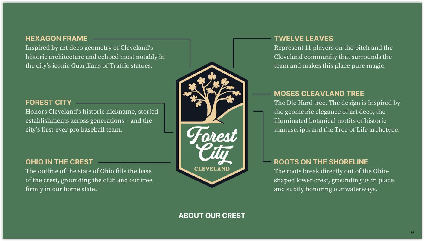 Part of a presentation describing how the new MLS Next Pro men’s team for Cleveland got its crest logo (CSG).