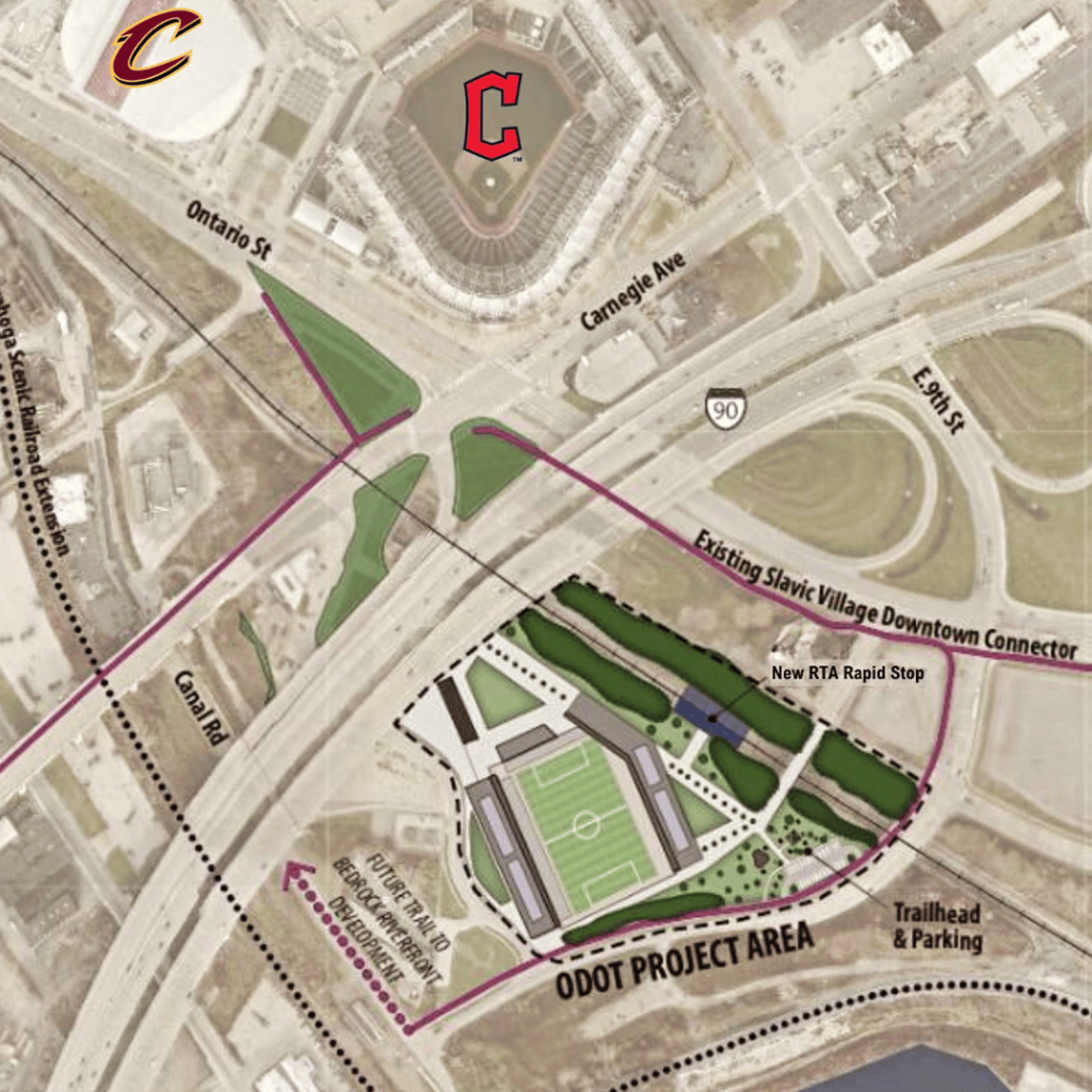 CSG is requesting a $19.9 million state grant for a nearly $80 million, 10,000-seat soccer stadium on 13.6 acres of land on East 9th Street Extension south of Interstate 90. The site is owned by the Ohio Department of Transportation. The Cleveland Metroparks has an option to buy the land, but be paid by CSG.