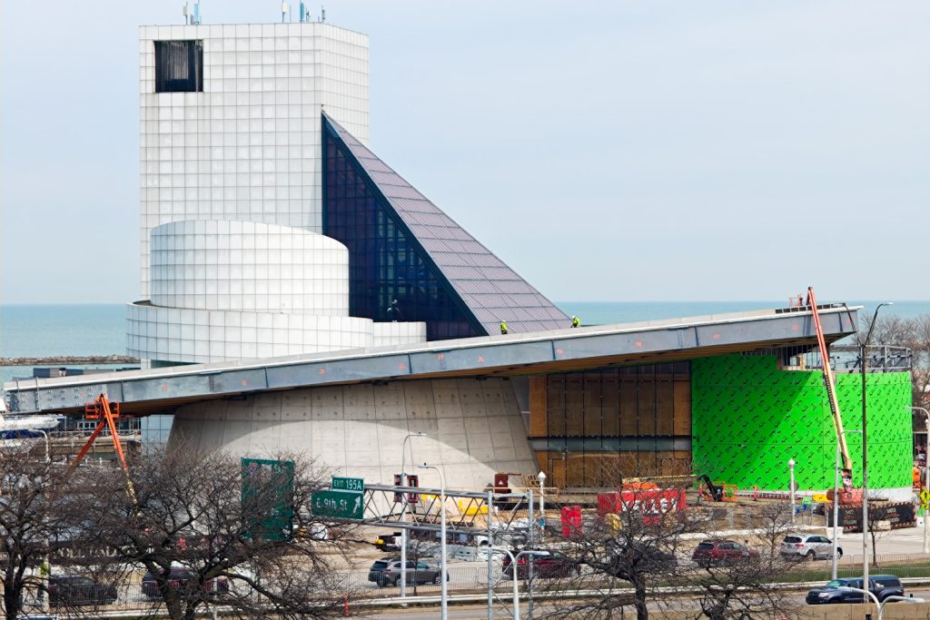 Across the Shoreway in Downtown Cleveland, expansion of the Rock & Roll Hall of Fame is well underway (Harrison Whittaker).