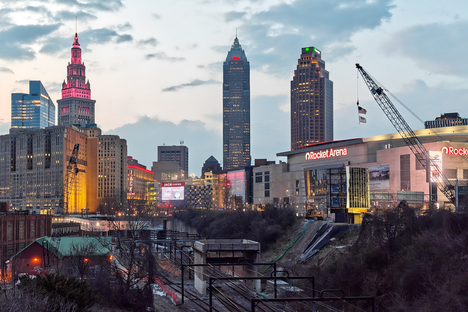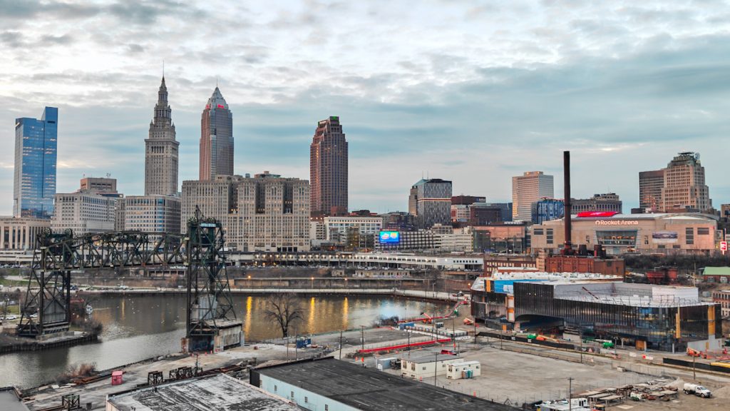 In less than a decade, the view of Downtown Cleveland from the Lorain-Carnegie will be dramatically altered. At bottom right, a 6,200-seat open-air amphitheater is planned (Harrison Whittaker).