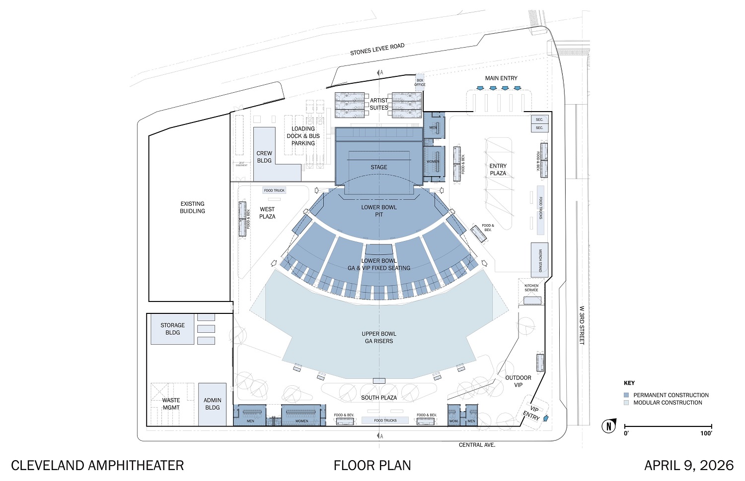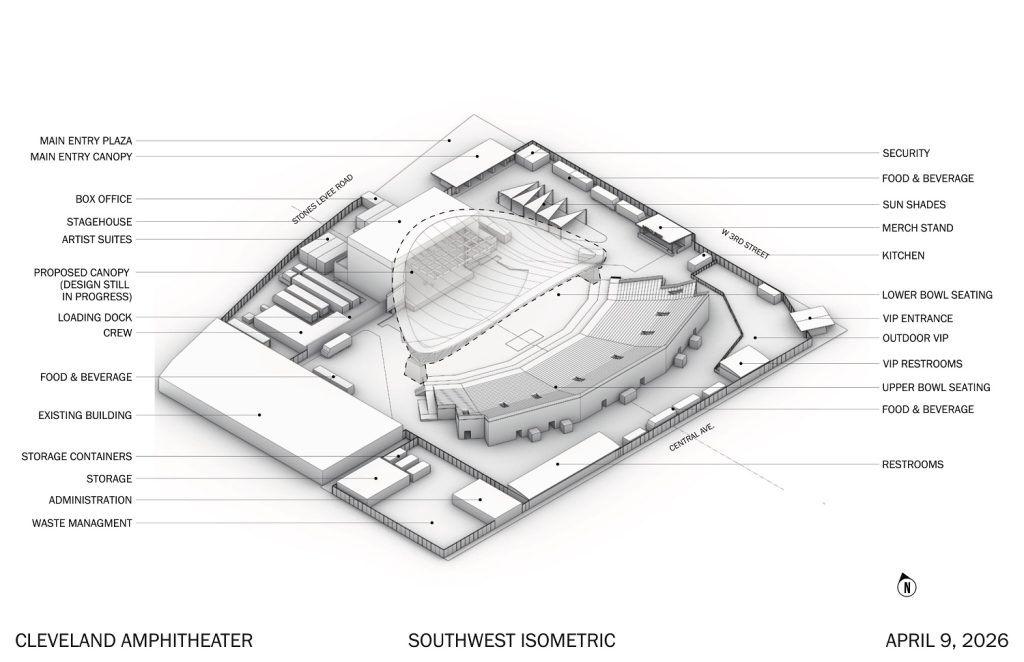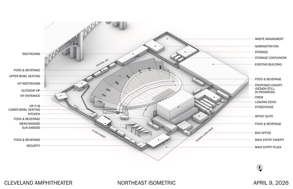 Bedrock Real Estate, the developer, and Live Nation, the operator, seek to build a 6,200-seat amphitheater at West 3rd Street and Stones Levee Road. NEOtrans broke the story in January about Bedrock’s property acquisition and cited insiders who said an amphitheater was the probable use of the land.