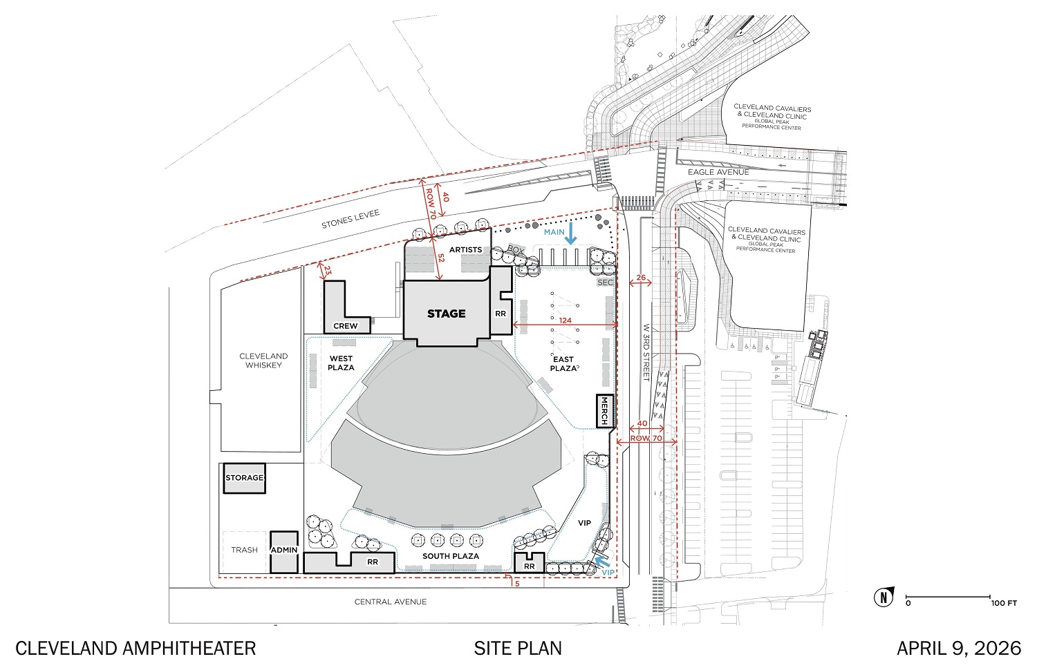 With north at the top of this overall site plan, the proposed amphitheater is shown in the context of its surroundings, from the Cleveland Clinic Global Peak Performance Center (including the Cleveland Cavaliers’ new practice facility) at upper-right and Cleveland Whiskey’s distillery, tasting room and planned restaurant to the left (Bedrock).