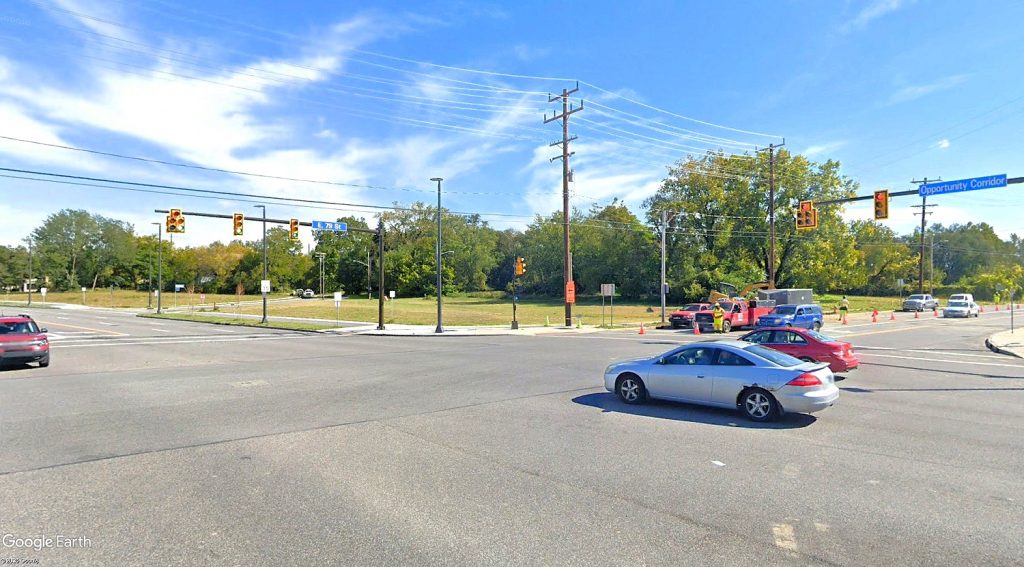Keep an eye on this spot. The southeast corner of Opportunity Corridor Boulevard and East 79th Street is targeted as the site for a significant laboratory and research center for the Cleveland Clinic. This would be a significant development that expands the Main Campus far south on the Opportunity Corridor and could result in additional spin-off development (Google).