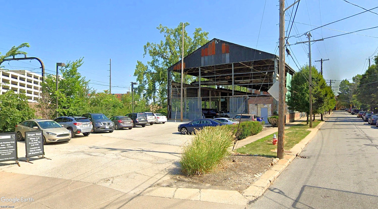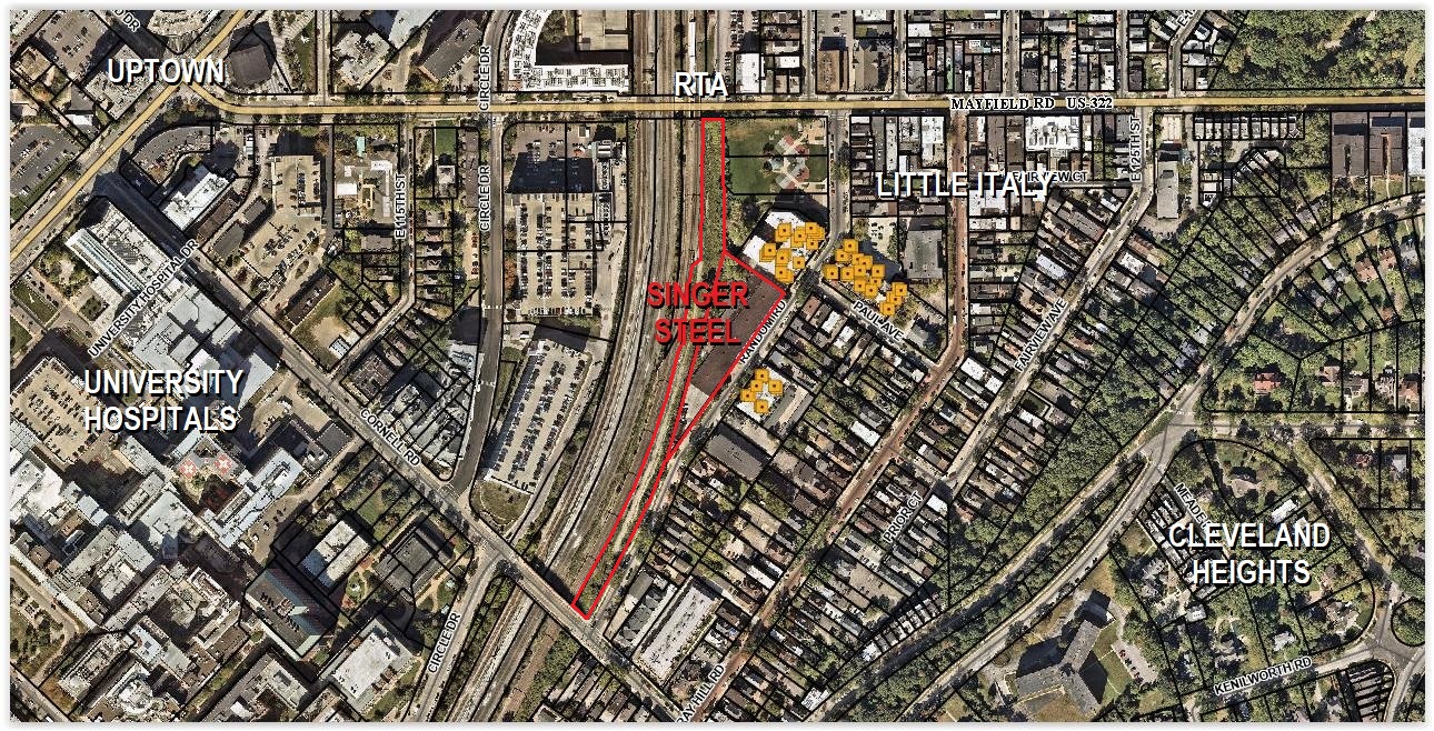 Singer Steel on Random Road in Cleveland’s Little Italy could soon enter a new chapters in its history — that of a residential and parking complex. The residential would be developed where the factory stands and the parking would be alongside the Red Line rapid transit, the power lines for which are visible at left (Google). CLICK IMAGES TO ENLARGE THEM.