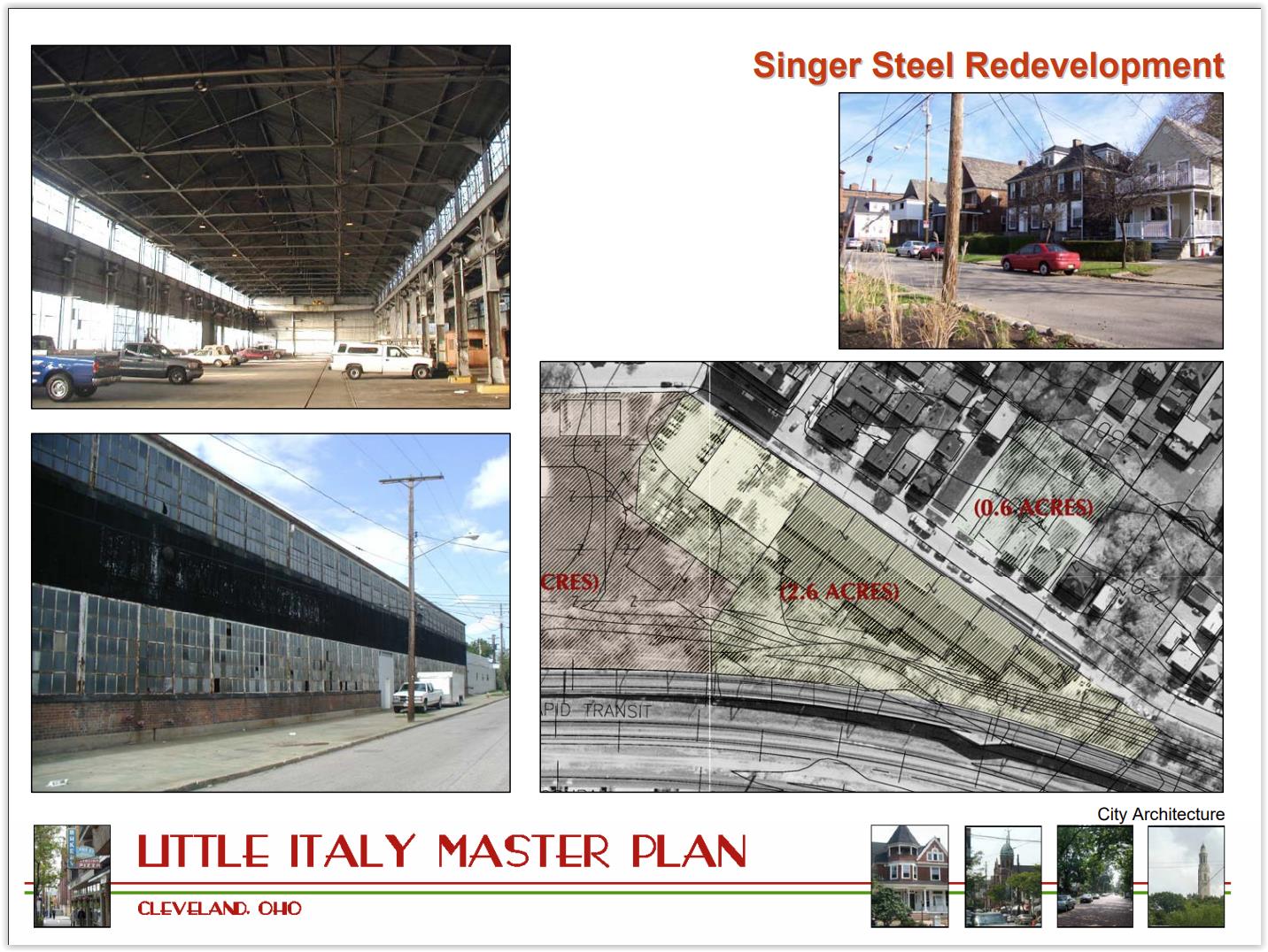 The Singer Steel site has been considered for redevelopment, beyond just parking, for at least 21 years. In 2005, City Architecture created a master plan for Little Italy that noted the factory had redevelopment potential (City Architecture).